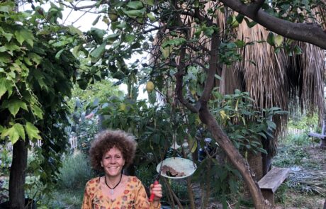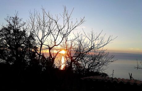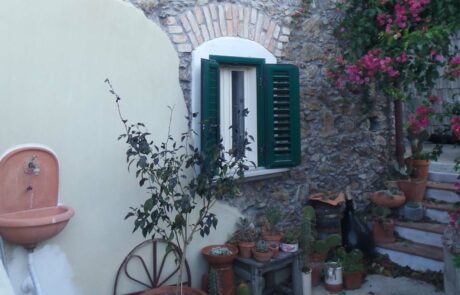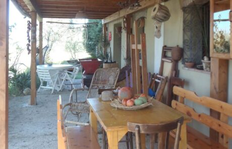 Vor der Wohnung liegt die überdachte Veranda mit Esstisch, von dem man auch über die Olivenhaine zum Meer blickt. Carmela und Renato wirtschaften für ihren eigenen Verbrauch, bauen biologisch Gemüse und Obst an, produzieren Olivenöl, haben Hühner, Hunde, zwei schneeweiße Katzen und einen großen Goldfischteich. Carmela stellt aus Olivenöl und verschiedenen Kräutern herrlich duftende Naturseifen her, gestaltet aus Ton Lampenschirme und Skulpturen unterschiedlichster Größe. Auch Renato ist ein passionierter Künstler der Keramik, Gärtner und hat eine sehr umfangreiche Sammlung von Peperoni Pflanzen aus der ganzen Welt.